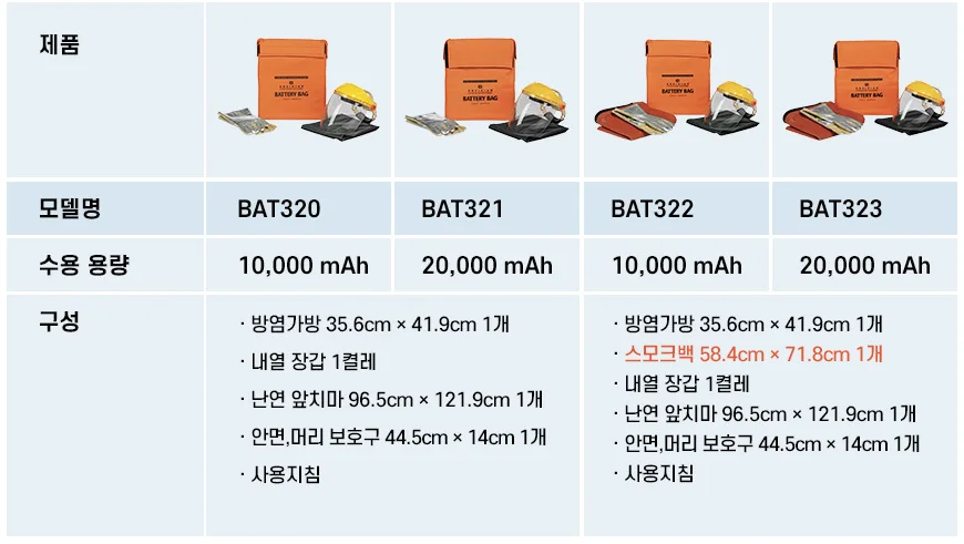 특히 BAT322·BAT323 모델은 ‘스모크백(Smoke Bag)’이 포함되어 있어 연기·가스 확산을 이중으로 차단하며, 실험실·정비소·공항 카고존 등 고밀도 리튬전지 취급 환경에서 강화된 격리 성능을 제공합니다.